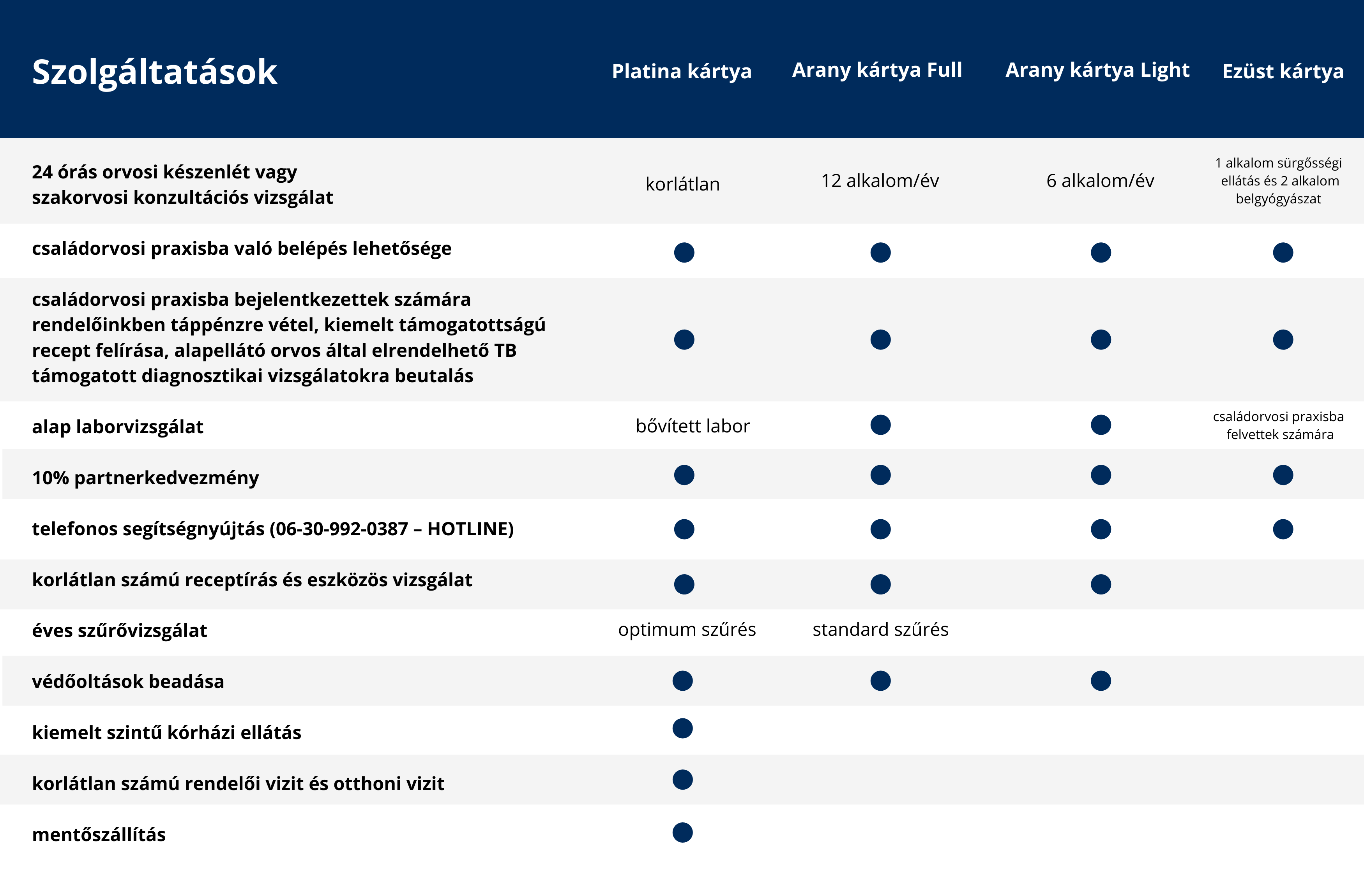 korlátlan számú háziorvosi vizsgálat, vérvétel, EKG, táppénzre vétel, laborvizsgálat, kiemelt támogatottságú recept felírása, beutalás TB által támogatott diagnosztikai vizsgálatokra, telefonos táv-konzultáció és táv-recept, éves influenza elleni védőoltás oltóanyaggal, gépjármű/vitorlás jogosítvány hosszabbítás és lőfegyvertartási alkalmasság megítélése